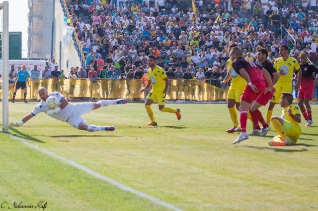 דורון רוזנקוביץ עוצר בעיטה של מוטי מלכה. ( צילום: רפי נחמיאס)