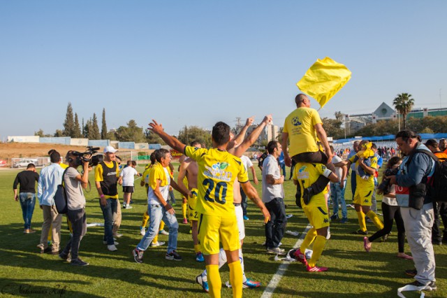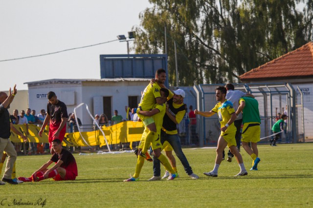 שחקני קרית גת חוגגים את השריקה עם גיבור המשחק : קובי נחמיאס.( צילום:רפי נחמיאס)