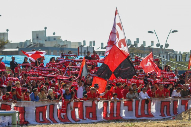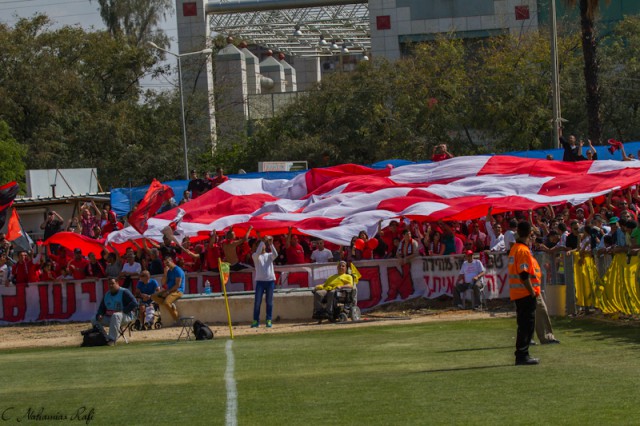 היציע שהוקם עבור אוהדי מרמורק נצבע באדום.( צילום:רפי נחמיאס)
