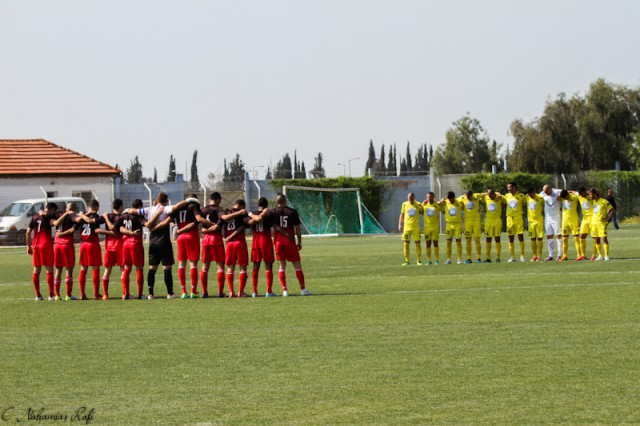 שחקני שתי הקבוצות בדקה דומיה לזכרה של זהבה ארז ז"ל אשתו של אלברט ארז ראש העיר לשעבר של קרית גת . יהי זכרה ברוך. ( צילום:רפי נחמיאס)
