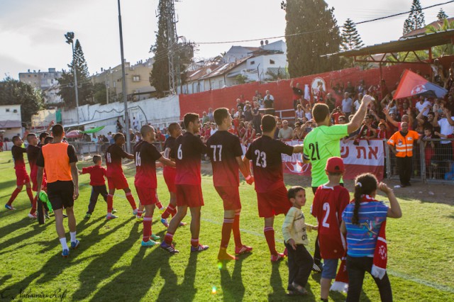 שחקני מרמורק חוגגים עם האוהדים בסיום . עם הפנים לדרבי מול שעריים. ( צילום: רפי נחמיאס)