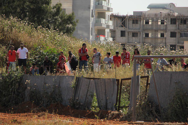 קומץ אוהדי מרמורק שהפרו את "מרד האוהדים" והסתננו אל הגבעות המקיפות את המגרש (צילום: איתמר מורז)