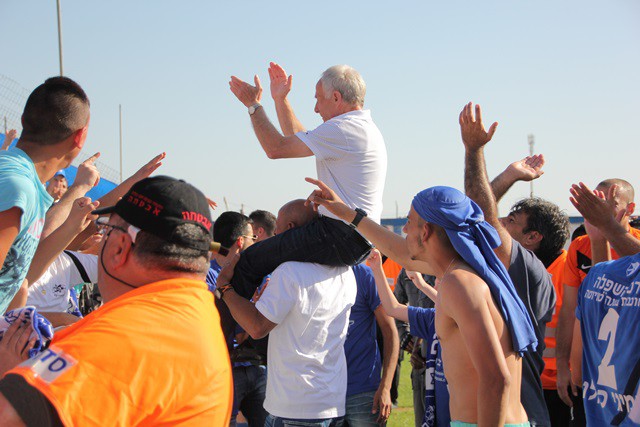מנחם איריס מונף על כתפיי האוהדים (צילום: איתמר מורז)