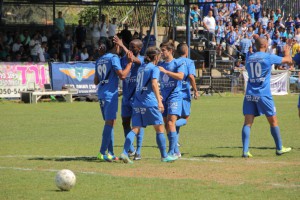 שחקני שעריים חוגגים את שער הבכורה של עומר הלוי. (צילום: איתמר מורז)