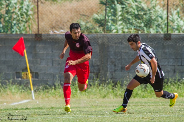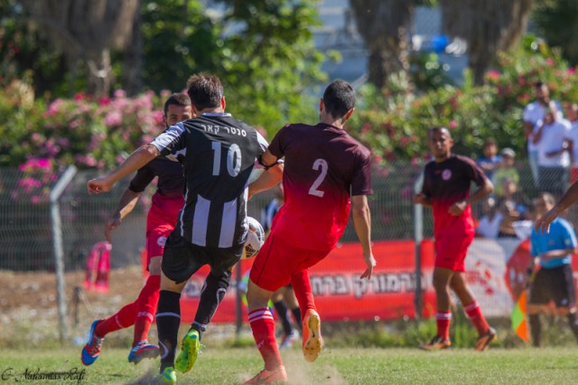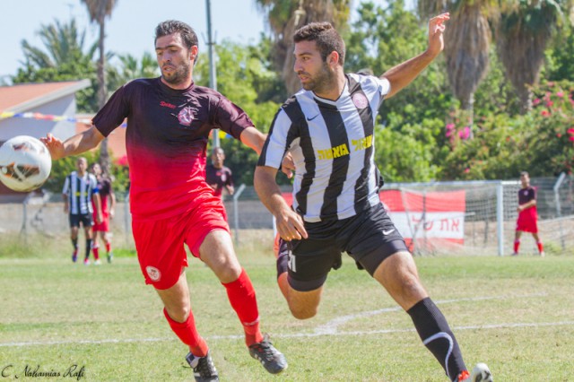 אפי מלכה מטווח את שערה של אזור. מחצית ראשונה טובה מאוד של מרמורק. ( צילום: רפי נחמיאס)