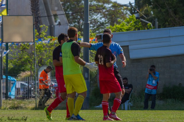 שחקני מרמורק מוחים בפני שי שיטרית על הפנדל המפוקפק. ( צילום: רפי נחמיאס)