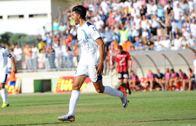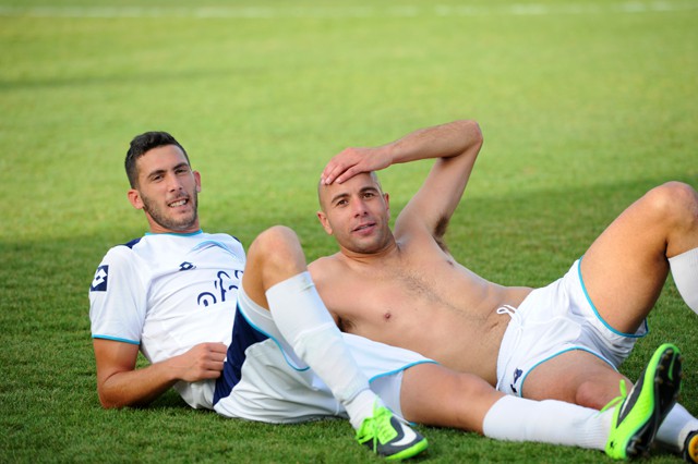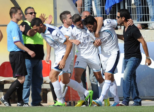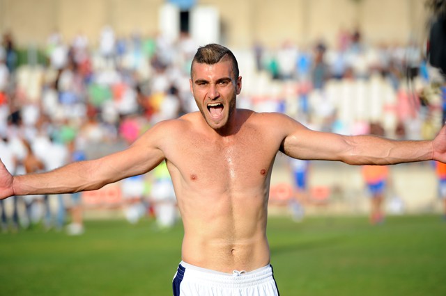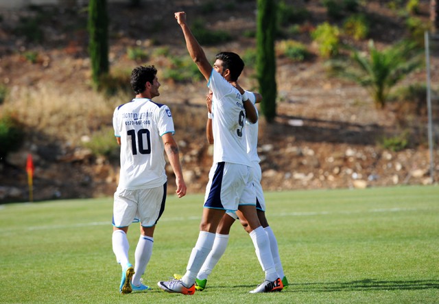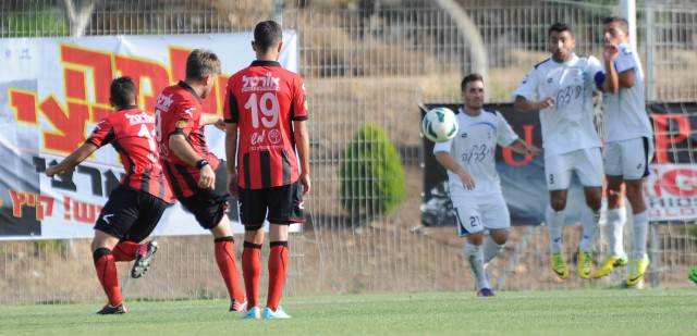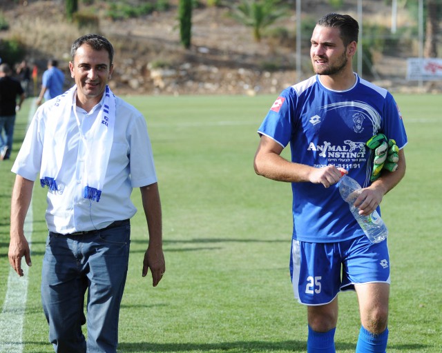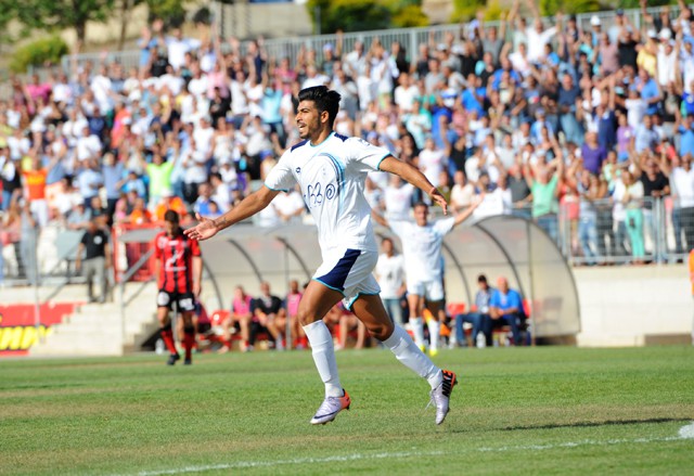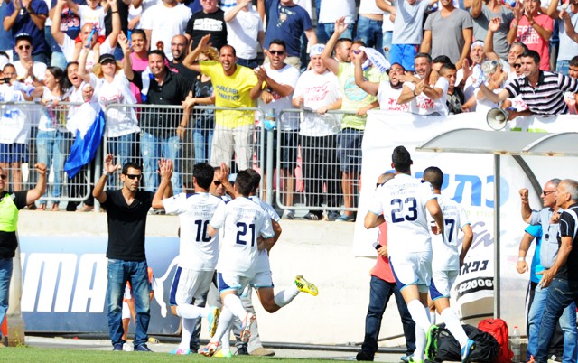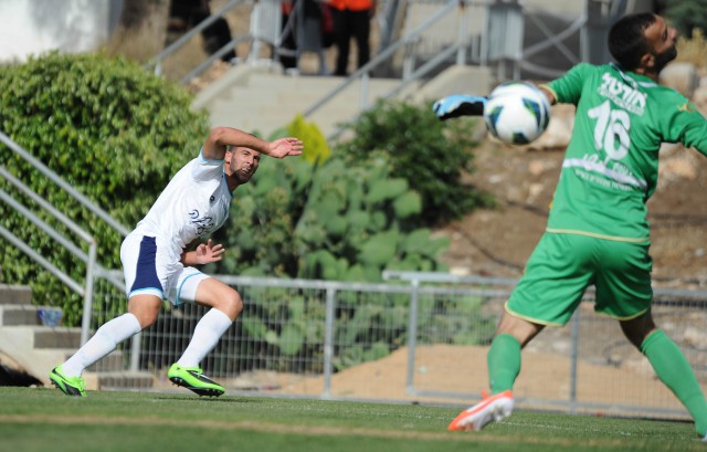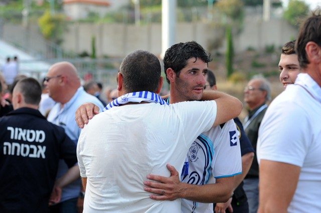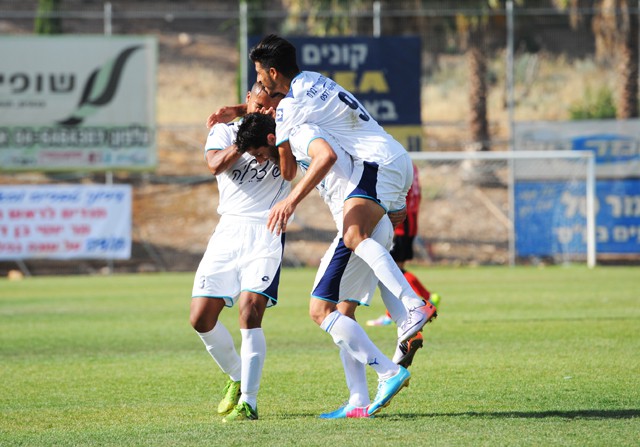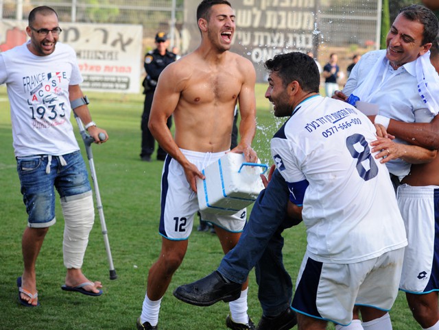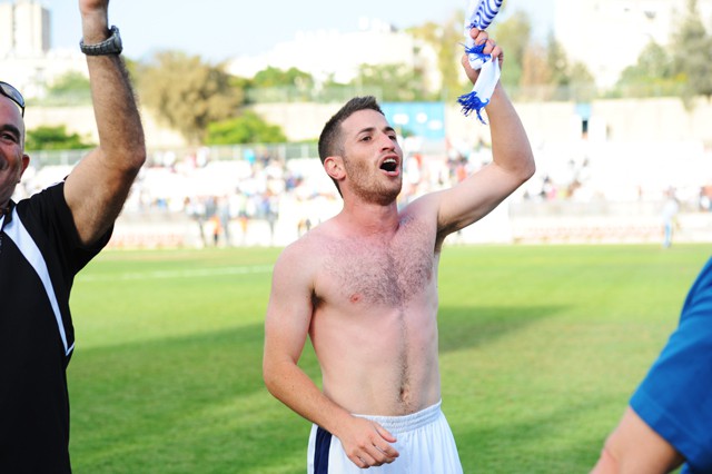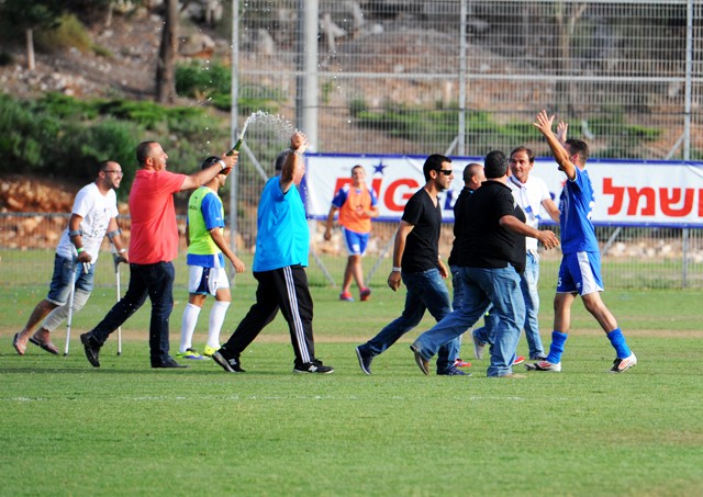 שלום עקיבא כובש מהנקודה הלבנה, ורץ לחגוג עם השחקנים. (אדיר נמרוד כץ, רמי גרידיש)