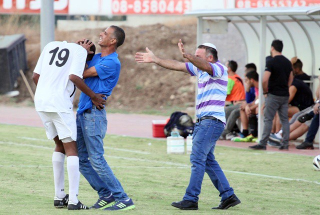 שוקי ממו חוגג עם דניאל סלומון. ספסל עמישב נראה מאוכזב. (צילום: רועי אסרף)
