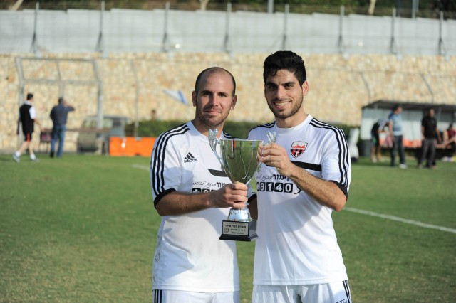 יוני יוסיפוביץ (משמאל) ויוסי גוטרמן עם הגביע המחוזי. (אדיר נמרוד כץ)