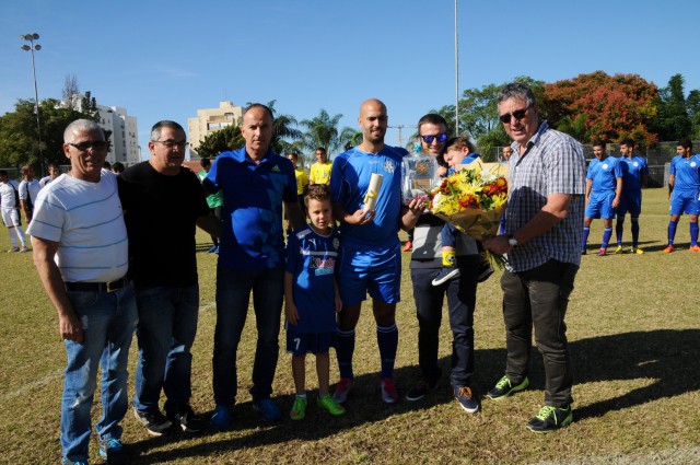 בתמונה: מר ישראל גל, ראש העיר קרית אונו, חנן אסור (קפטן הקבוצה) ונציגי ההנהלה- מעניקים לאמיתי מגן הוקרה ופרחים. ׁ(איתן ידגר)