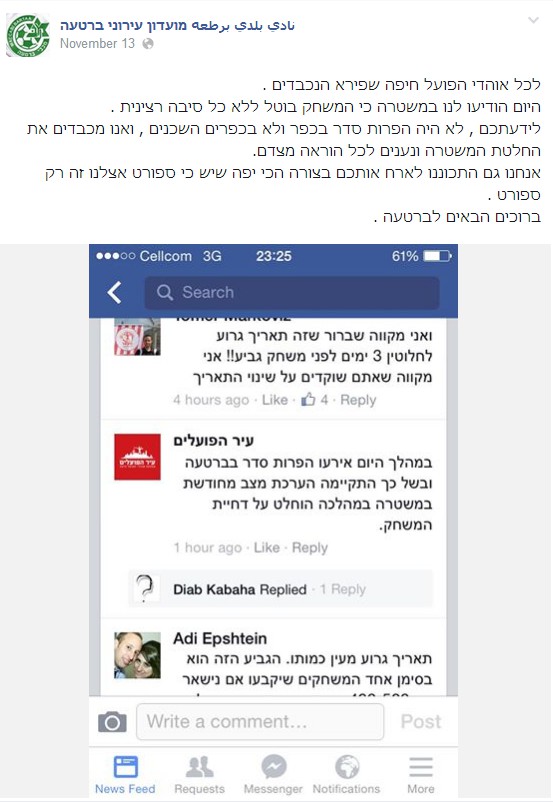ההודעה של מכבי עירוני ברטעה על ביטול המשחק