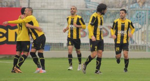 שחקני כפ"ס חוגגים, במרכז חי אטיאס ואלעד כהן, המצטיינים במגרש אמש (צילום: איתמר מורז)