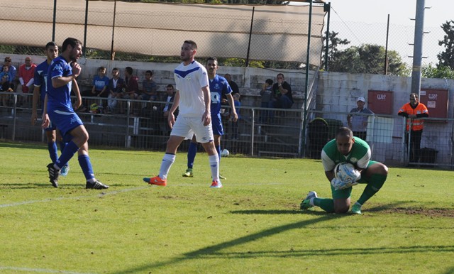שיאון אזולאי, שוער כפר יונה, הודף את ניסיון הבקעה של טל חבה מקרית אונו. (צילום: איתן ידגר)
