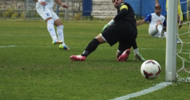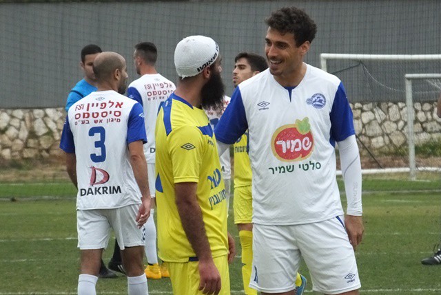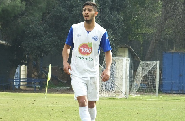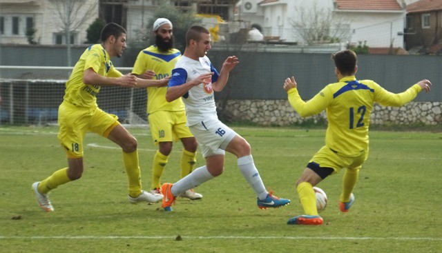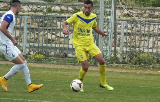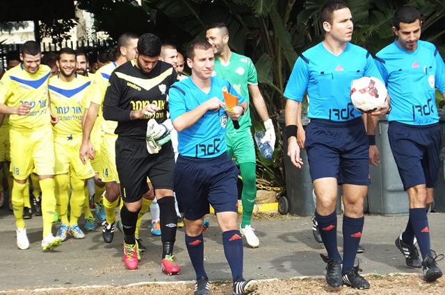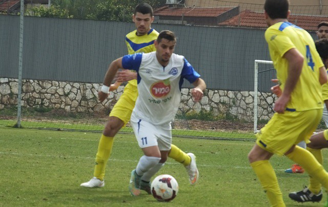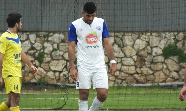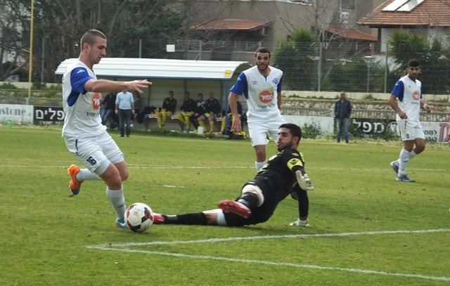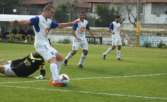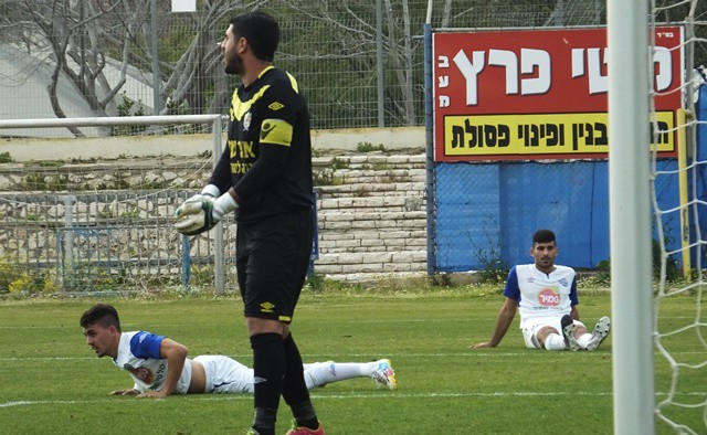 תומר אוחנה, מגלגל את הכדור ליד הקורה, שחקני יפו לא מאמינים שהכדור לא ברשת. (אביחי חיים)