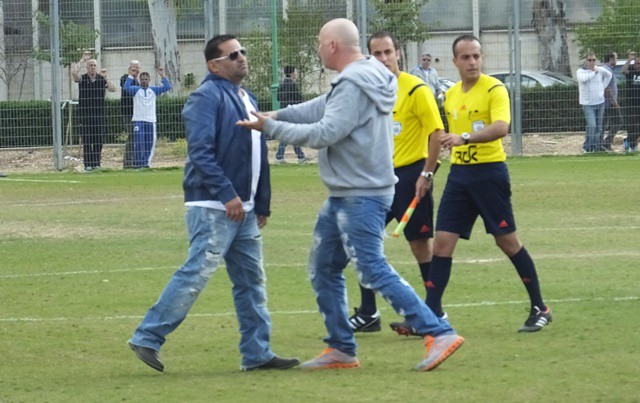 אשר עזרן מרחיק את אילן אלפסי ממקום העימות. (אביחי חיים)