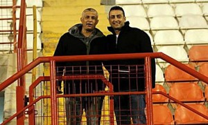 אוהד רון ואיתן שלום. איתן יו"ר הפועל ראשון לציון וחבר מועצת העיר בראשון, מכיר היטב את ליגה א'. (צילום: עודד חסין)