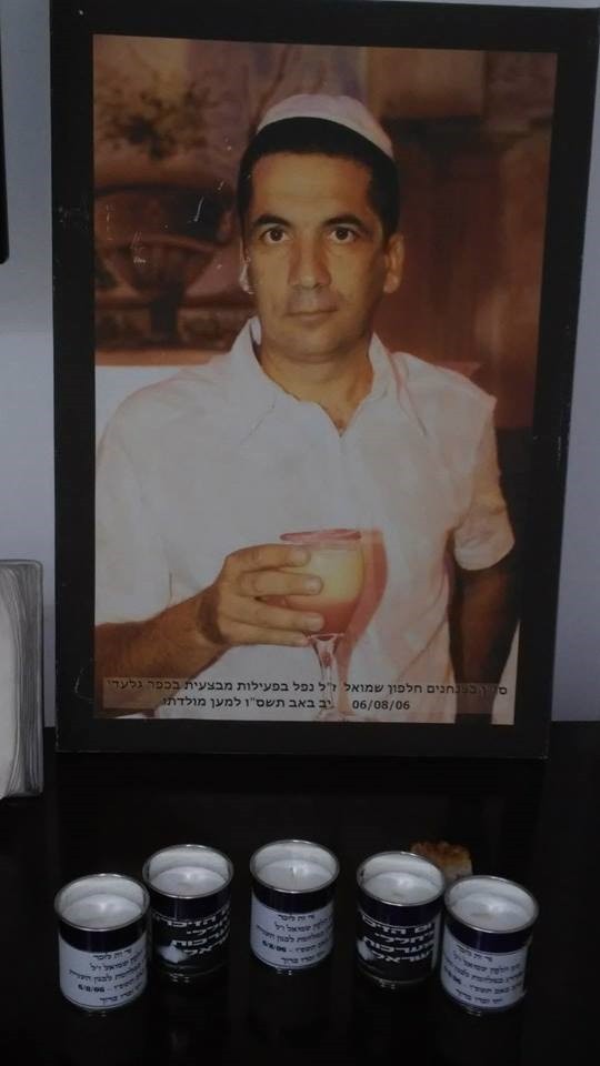 סגן שמואל (שמוליק) חלפון, נפל בקרב בגבול הצפון במלחמת לבנון השנייה ביום י"ב באב תשס"ו (6.8.2006), בן 41 ו-8 חודשים היה בנופלו. קטיושה שנורתה משטח לבנון אל עבר קיבוץ כפר גלעדי הרגה אותו ואת חבריו ליחידה. "דיברתי איתו בבוקר, יצרתי קשר עם מישהו אחר כי הטלפון שלו לא עבד. כל בוקר בזמן המלחמה, הייתי מדליקה את הרדיו והאינטרנט ובאותו היום לא הדלקתי. בשעה 12 ודקה החל מבול של טלפונים מאנשים ששאלו מה קורה, ומה קרה. הבנתי תוך כדי השיחות הזורמות ששמוליק נשאר שם רק עם הרווקים ואת כל הנשואים הוא שלח הביתה. לא ידענו מה קורה, התקשרתי לכל מקום אפשרי, לכל בית חולים אפשרי עד שענה לי שוטר צבאי מכפר גלעדי. בשעה 18:00 באותו היום, קיבלנו את דפיקת הדלת הנוראית. לא רציתי להאמין שבעלי, האבא של ילדיי נהרג. לא נתתי להם לקבור אותו עד שלא ראיתי במו עיניי את גופתו, "למזלי" שמוליק היה יחסית שלם בניגוד לאחרים ויכולתי לזהות אותו".