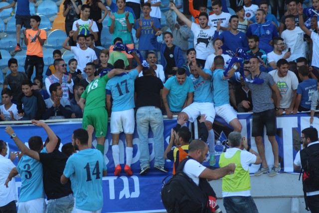 שחקני בית שאן חוגגים עם האוהדים. (אביב עובדיה)