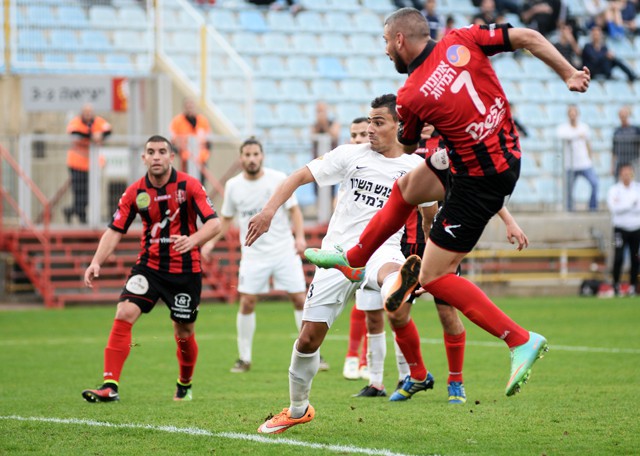 אדם מזרחי כובש באחד משערי העונה בדקה ה95 בהרצליה, אולי שער העונה? (צילום: רמי גרידיש)