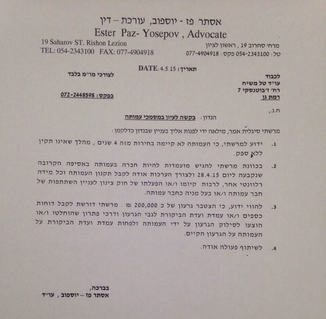 המכתב הנשלח ליפו. (יח"צ)