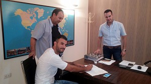דור אלקבץ חותם על החוזה. לידו בילאל בדיר ומועד בדיר מימין.