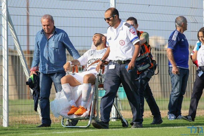 שלומי מראד מורד מהמגרש בדרכו לבי"ח. (צילום: מאור אלקסלסי)