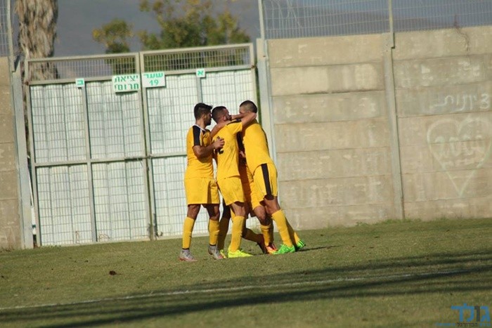 שחקני מכבי דליה חוגגים את השער יתרון.(צילום: אביב עובדיה)