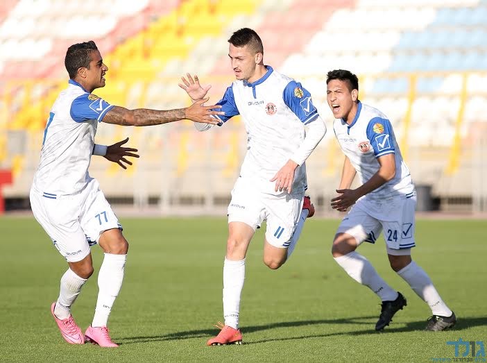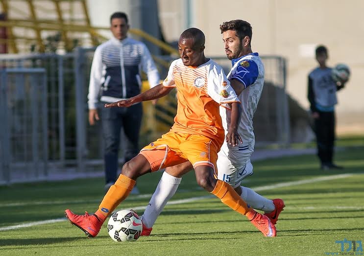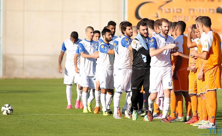 מיכאל זנברג מקדים את איתמר כהן בלבן. עמית בן שושן מביט. (רמי גרידיש)