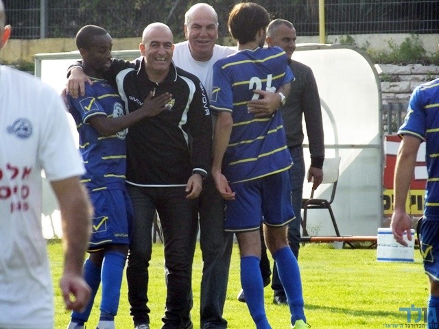 הבעלים של השיכון, יששכר בוריה מרוצה מהניצחון, אשר עזרן המנהל המיתולוגי של יפו בעבר קצת פחות. (אביחי חיים)